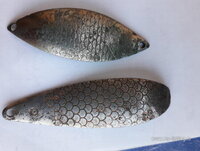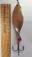 Два "Липестка", "Бычок" и должна быть ещё одна узкая блесна. С обратной стороны все блёсны окрашены красной краской. Очень похоже, что они из одного набора. Длина блесны "Липесток" - 28 мм, ширина - 14 мм, вес - несколько грамм. Вполне возможно, что блесны с такими параметрами были "Новинкой" тогда, а то, что наша промышленность не выпускала спиннингов способных забросить эту блесну, похоже никого не волновало.
