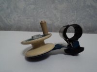 б) задний диск катушки штампованный из дюралюминия с укреплённой на нём: стальной цилиндрической, шлифованной осью, тормозной стальной, кольцеобразной пружиной, стальным зубчиком, соединенным с кнопкой, свободно передвигающейся в прорези диска.
