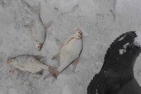 Я больше люблю на чёртика на Можае побегать, но настроение было не беготное. Посему решил выбрать три основные лунки на небольшой бровке, опустить туда мотыльные снасти, а с чёртиком и безмотылкой периодически проверять остальное. Так и сделал. На основные поставил два кивка (благо погода позволяла) и поплавковое коромысло. А сам двинул на мелководье с чёртиком. Начало на чёртика по нолям. Иду на основные лунки и опускаю насадку на дно. Начинаются шевелюшки и подергивания. Хрен подсечёшь. Ах вы так?! Вытаскиваю поплавок и опускаю черта. Типа ЩА Я ВАС ВЫД..ЧУ. В итоге, после любой шевелёнки на двух соседних лунках, я максимум с третьей проводки вытаскивал виновника шевелёнок. До обеда статистика по рыбам чёртик:мотыль была в соотношении 4:1. А после обеда всё поменялось. На чёртика невнятные тычки (причём проводку разнообразил - тычки были только при проводке короткими резкими ступеньками вверх, а до обеда брало на плавную медленную размашистую проводку). Зато на кивки были конкретные тычки, а потом подъёмы - тока секи.