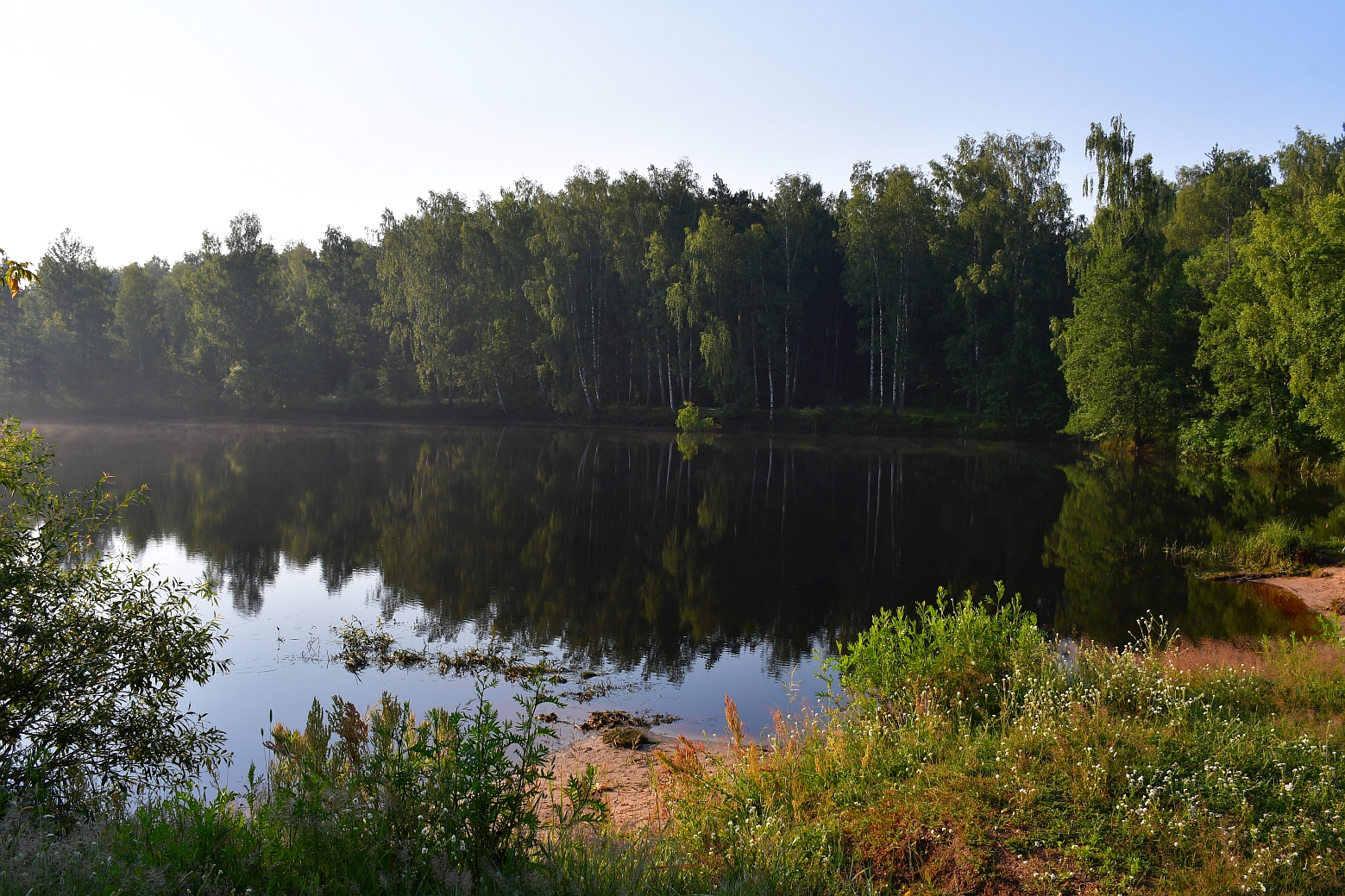 Вчера вечером поехал. Думаю поехать не на последней эл-ке, а чуток пораньше, что бы поспать на берегу. Доехал до Подосинок. Смотрю всё мокрое! Видимо там дождь был. Вся трава, деревья, на дороге лужи. Фонарик в лоб и вперёд! А тут даже не туман, а взвесь мокрая крупная висит. Фонарик на открытых участках её почти не пробивает. Пелена. Ладно. Дошёл до Нерской. Там 3 сосны мои любимые, где забомжевать можно. В этот раз был трезвый, даже самогонки с собой не взял и днём до рыбалки ни грамма не выпил! Несколько банок пива было. Пытался поспать, но комары одолели. Была прыскалка, но она оказалась неэффективной. Вот часа 4 боролся с комарами. Нифига не поспал. Перед рассветом вышел на реку. Где то в 3-50. А сапог я с собой не взял. Зачем??? Плюс 30 везде! А там всё мокрое и трава по яйца. Прошёлся немного, вымок. Одел шлёпки пляжные. Кроссовки убрал в рюкзак. А в них скользко! Ловил на воблеры и мало на вертушки. Потом мне это надоело и я ушёл на земснаряд, откуда Нерская вытекает. Там ещё половил чуток. Искупался и в 7-30 утра пошёл на станцию, ибо жара уже наступала.