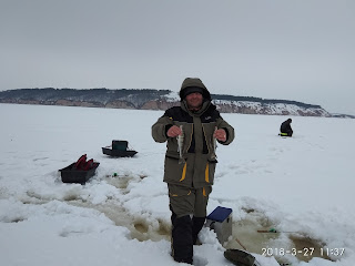 Бураны с рыбаками могли проехать только в два места по набитой дороге, немного в сторону и можно было бы выкапывать целый день, по дороге было видно, что уже этим занимались не раз, так что рисковать не стали. Вода на три метра выше обычного уровня, соответственно рыбы на привычных местах днём с огнём... Снега пол метра с плюсом, под ним ещё мокрый снег с водой и на полный шнек лёд. Сверлить и искать рыбу одно удовольствие. После нескольких лунок, решил забить с поисками судака и всего остального и почаще посещать "чипок", как назвали палатку ребята, в котором дверь была открыта целый световой день.